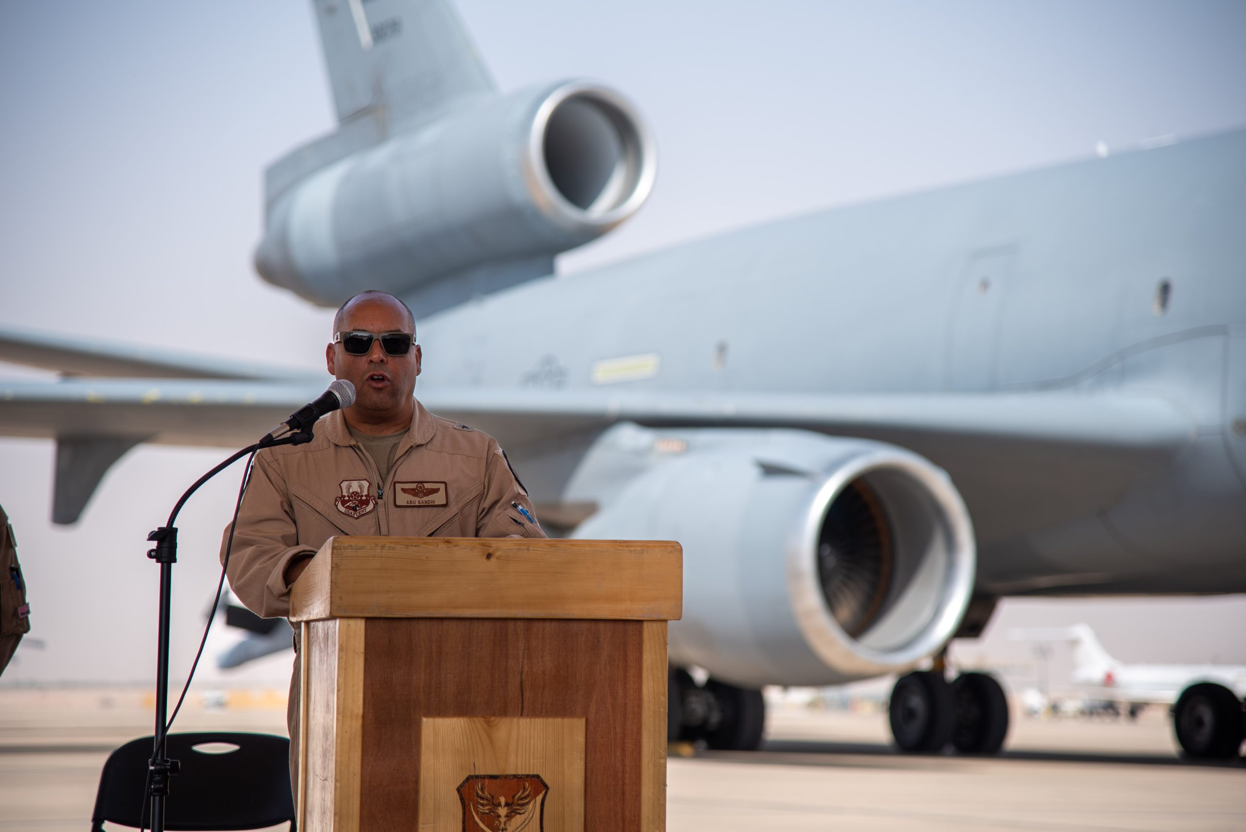 U.S. Air Force Brig. Gen. Akshai Gandhi, 378th Air Expeditionary Wing commander, delivers his remarks during the inactivation ceremony for the 908th Expeditionary Air Refueling Squadron at Prince Sultan Air Base, Kingdom of Saudi Arabia, Oct. 4, 2023. The ceremony highlighted the legacy of the KC-10 after over 30 years of service within the U.S. Air Forces Central (AFCENT) Area of Responsibility. By September 2024, the U.S. Air Force’s fleet of KC-10s will be decommissioned and gradually replaced by the KC-46 aircraft. (U.S. Air Force photo by Tech. Sgt. Alexander Frank)