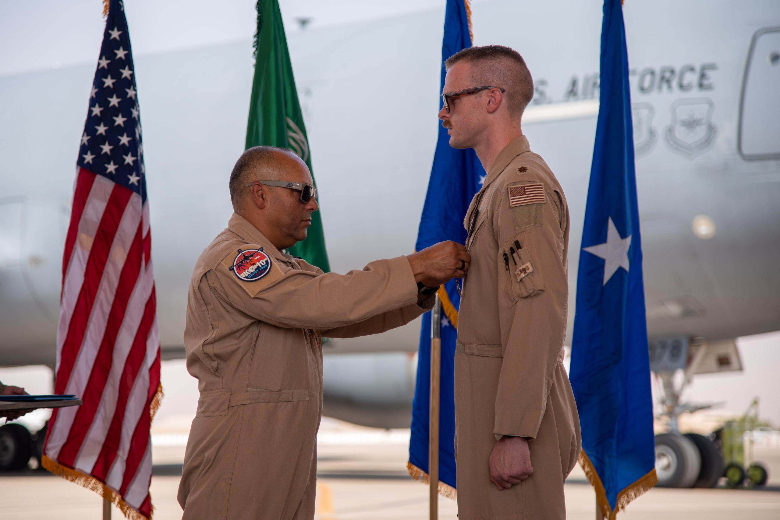 U.S. Air Force Brig. Gen. Akshai Gandhi (left), 378th Air Expeditionary Wing commander, pins a Meritorious Service Medal onto Maj. Joseph Rush (right), 908th Expeditionary Air Refueling Squadron (EARS) commander, during the inactivation ceremony for the 908th EARS at Prince Sultan Air Base, Kingdom of Saudi Arabia, Oct. 4, 2023. The ceremony highlighted the legacy of the KC-10 after over 30 years of service within the U.S. Air Forces Central (AFCENT) Area of Responsibility. By September 2024, the U.S. Air Force’s fleet of KC-10s will be decommissioned and gradually replaced by the KC-46 aircraft. (U.S. Air Force photo by Tech. Sgt. Alexander Frank)