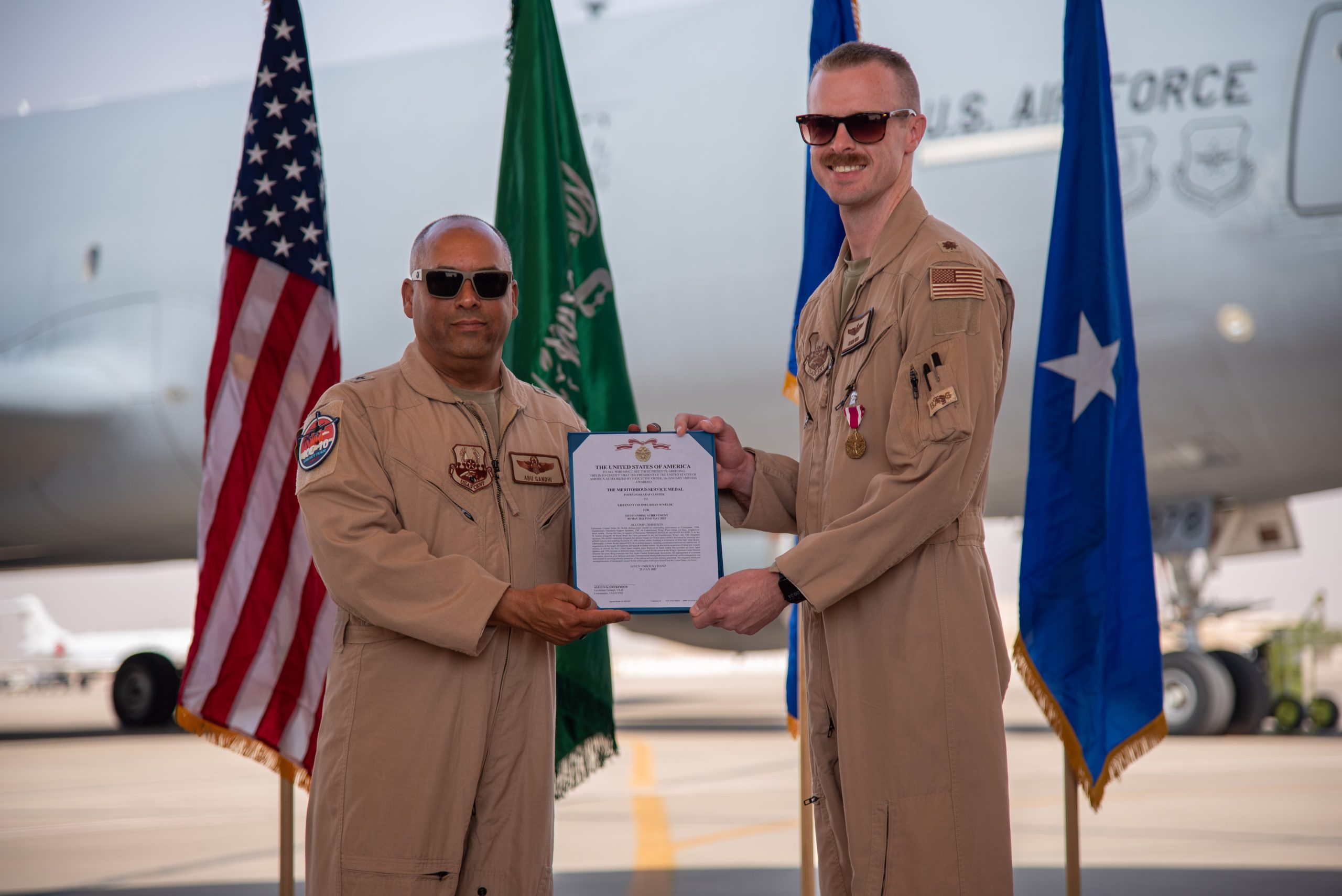 U.S. Air Force Brig. Gen. Akshai Gandhi (left), 378th Air Expeditionary Wing commander, poses for a photo after presenting Maj. Joseph Rush (right), 908th Expeditionary Air Refueling Squadron (EARS) commander, the Meritorious Service Medal during the inactivation ceremony for the 908th EARS at Prince Sultan Air Base, Kingdom of Saudi Arabia, Oct. 4, 2023. The ceremony highlighted the legacy of the KC-10 after over 30 years of service within the U.S. Air Forces Central (AFCENT) Area of Responsibility. By September 2024, the U.S. Air Force’s fleet of KC-10s will be decommissioned and gradually replaced by the KC-46 aircraft. (U.S. Air Force photo by Tech. Sgt. Alexander Frank)