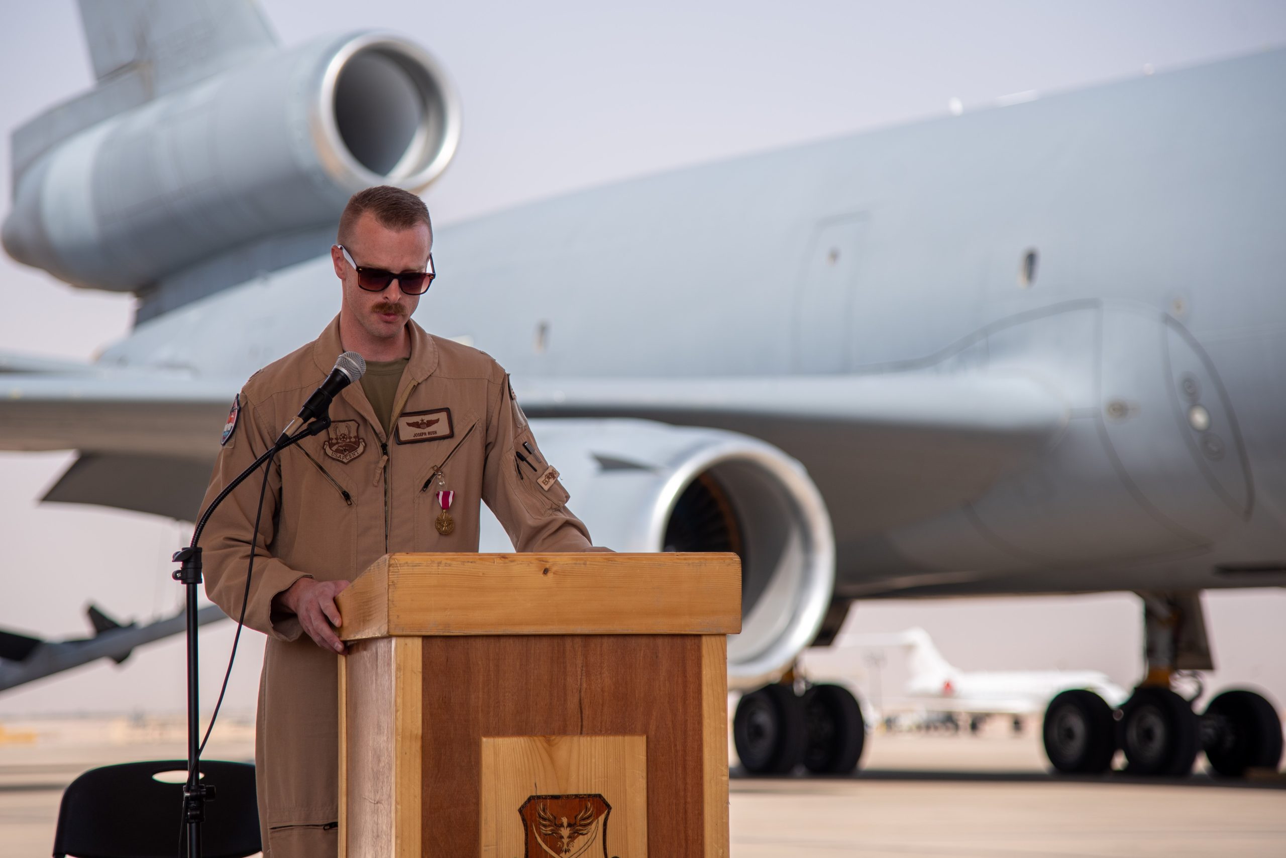 U.S. Air Force Maj. Joseph Rush, 908th Expeditionary Air Refueling Squadron (EARS) commander, delivers his final remarks as commander during the inactivation ceremony for the 908th EARS at Prince Sultan Air Base, Kingdom of Saudi Arabia, Oct. 4, 2023. The ceremony highlighted the legacy of the KC-10 after over 30 years of service within the U.S. Air Forces Central (AFCENT) Area of Responsibility. By September 2024, the U.S. Air Force’s fleet of KC-10s will be decommissioned and gradually replaced by the KC-46 aircraft. (U.S. Air Force photo by Tech. Sgt. Alexander Frank)