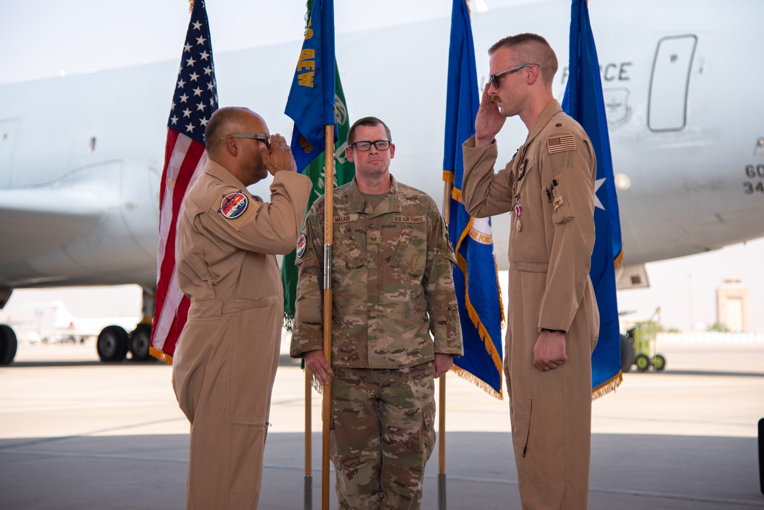 U.S. Air Force Maj. Joseph Rush (right), 908th Expeditionary Air Refueling Squadron (EARS) commander, salutes Brig. Gen. Akshai Gandhi (left), 378th Air Expeditionary Wing commander, prior to passing the 908th EARS guidon during an inactivation ceremony at Prince Sultan Air Base, Kingdom of Saudi Arabia, Oct. 4, 2023. The ceremony highlighted the legacy of the KC-10 after over 30 years of service within the U.S. Air Forces Central (AFCENT) Area of Responsibility. By September 2024, the U.S. Air Force’s fleet of KC-10s will be decommissioned and gradually replaced by the KC-46 aircraft. (U.S. Air Force photo by Tech. Sgt. Alexander Frank)