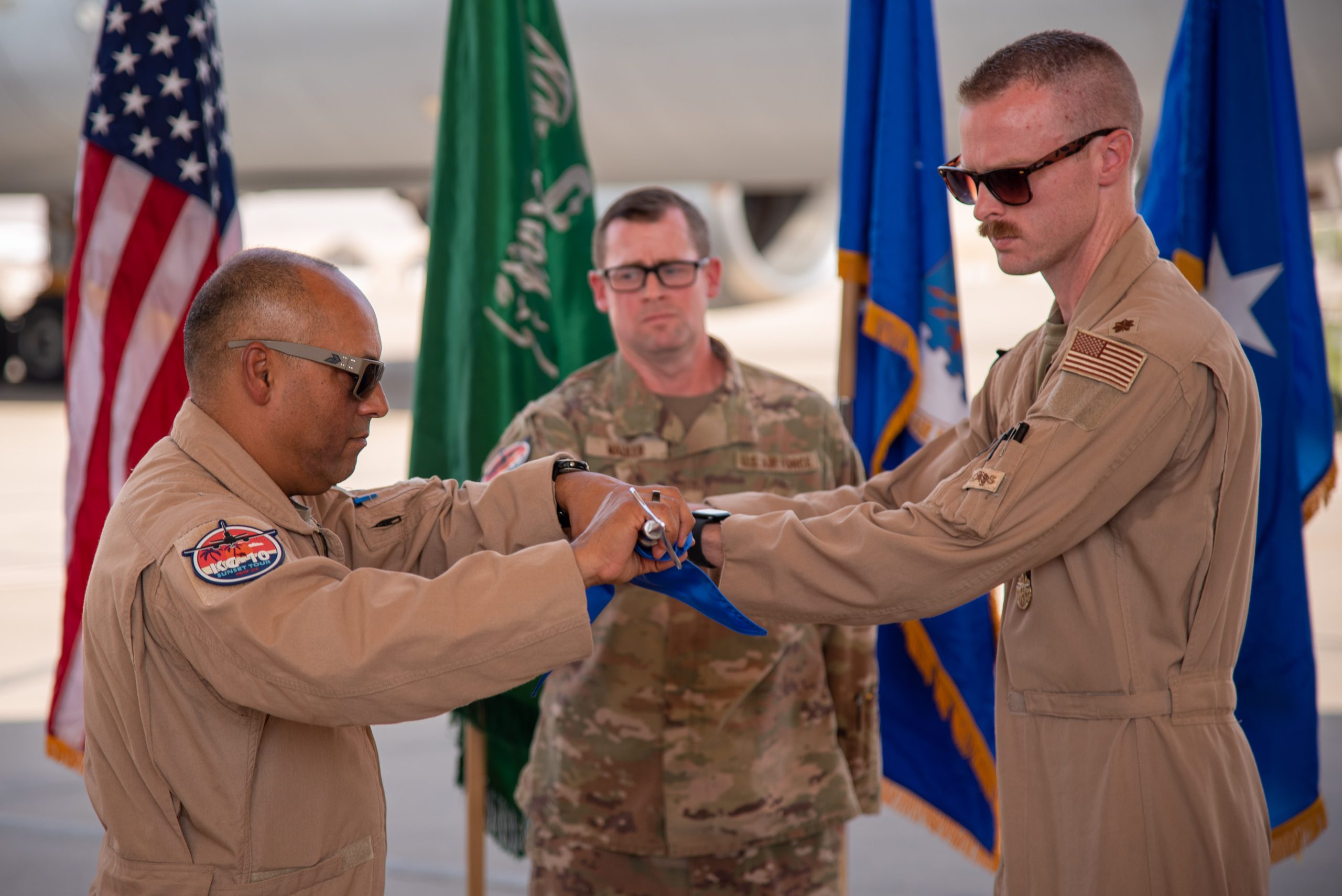 U.S. Air Force Maj. Joseph Rush (right), 908th Expeditionary Air Refueling Squadron (EARS) commander, and Brig. Gen. Akshai Gandhi (left), 378th Air Expeditionary Wing commander, roll-up the 908th EARS guidon during an inactivation ceremony at Prince Sultan Air Base, Kingdom of Saudi Arabia, Oct. 4, 2023. The ceremony highlighted the legacy of the KC-10 after over 30 years of service within the U.S. Air Forces Central (AFCENT) Area of Responsibility. By September 2024, the U.S. Air Force’s fleet of KC-10s will be decommissioned and gradually replaced by the KC-46 aircraft. (U.S. Air Force photo by Tech. Sgt. Alexander Frank)
