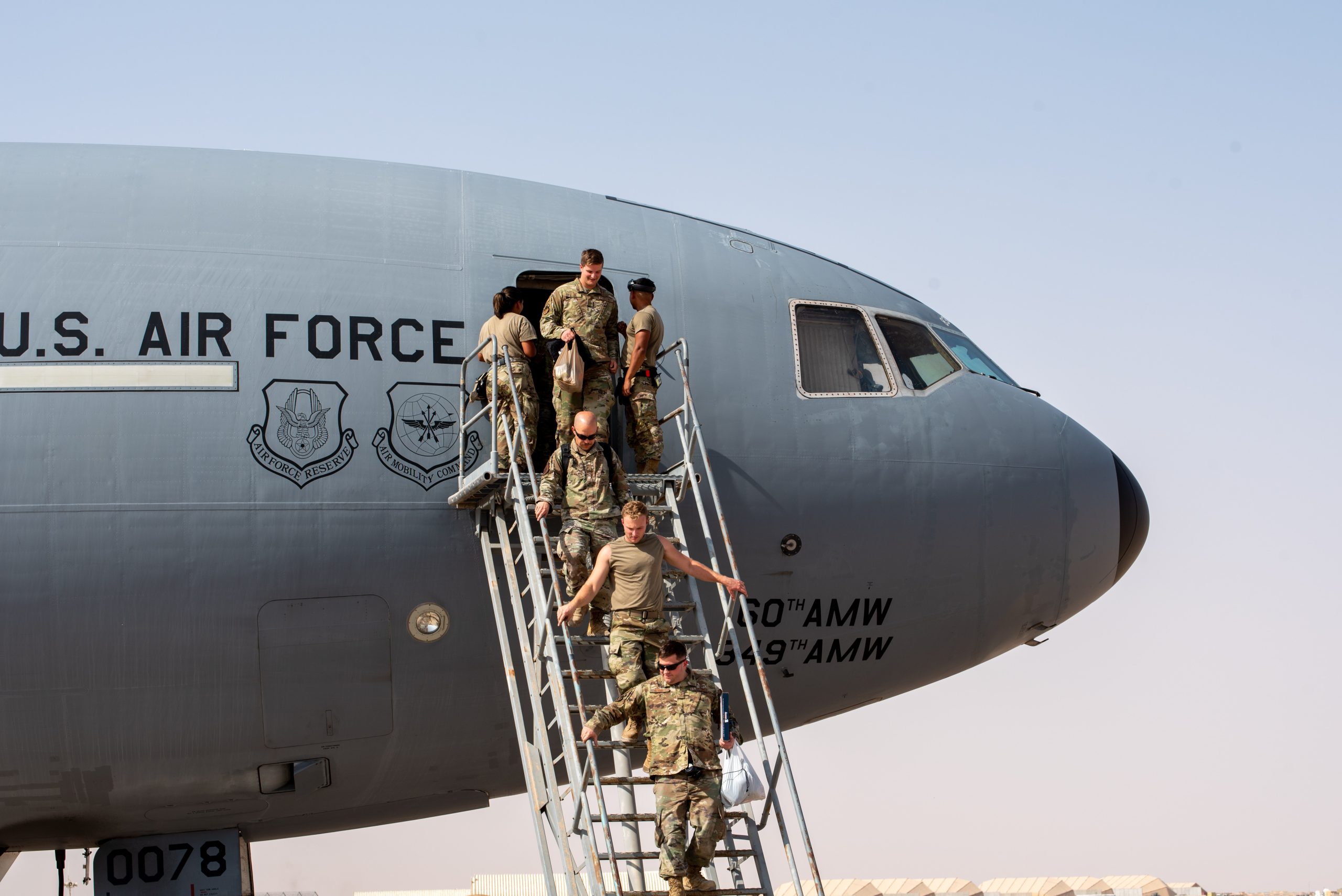 U.S. Airmen from the 908th Air Refueling Squadron exit a KC-10 Extender after the aircraft returned from the airframe’s final combat sortie on Prince Sultan Air Base, Oct. 3, 2023. The flight served as a capstone for the KC-10 after over 30 years of service within the U.S. Air Forces Central (AFCENT) Area of Responsibility. By September 2024, the U.S. Air Force’s fleet of KC-10s will be decommissioned and gradually replaced by the KC-46 aircraft. (U.S. Air Force photo by Tech. Sgt. Alexander Frank)