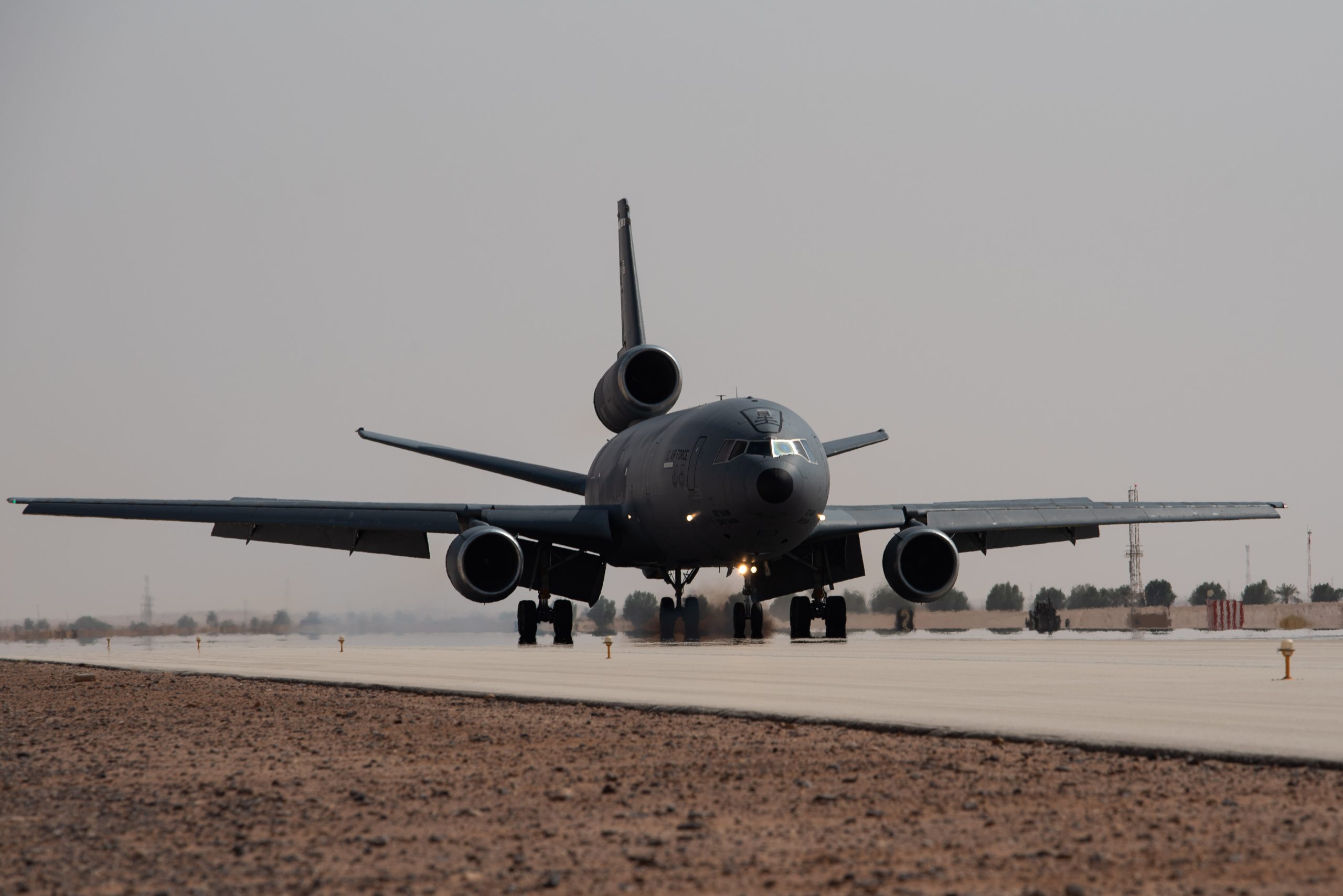 A KC-10 Extender assigned to the 908th Air Refueling Squadron lands after conducting the airframe’s final combat sortie before inactivation at Prince Sultan Air Base, Kingdom of Saudi Arabia, Oct. 3, 2023. The flight served as a capstone for the KC-10 after over 30 years of service within the U.S. Air Forces Central (AFCENT) Area of Responsibility. By September 2024, the U.S. Air Force’s fleet of KC-10s will be decommissioned and gradually replaced by the KC-46 aircraft. (U.S. Air Force photo by Tech. Sgt. Alexander Frank)