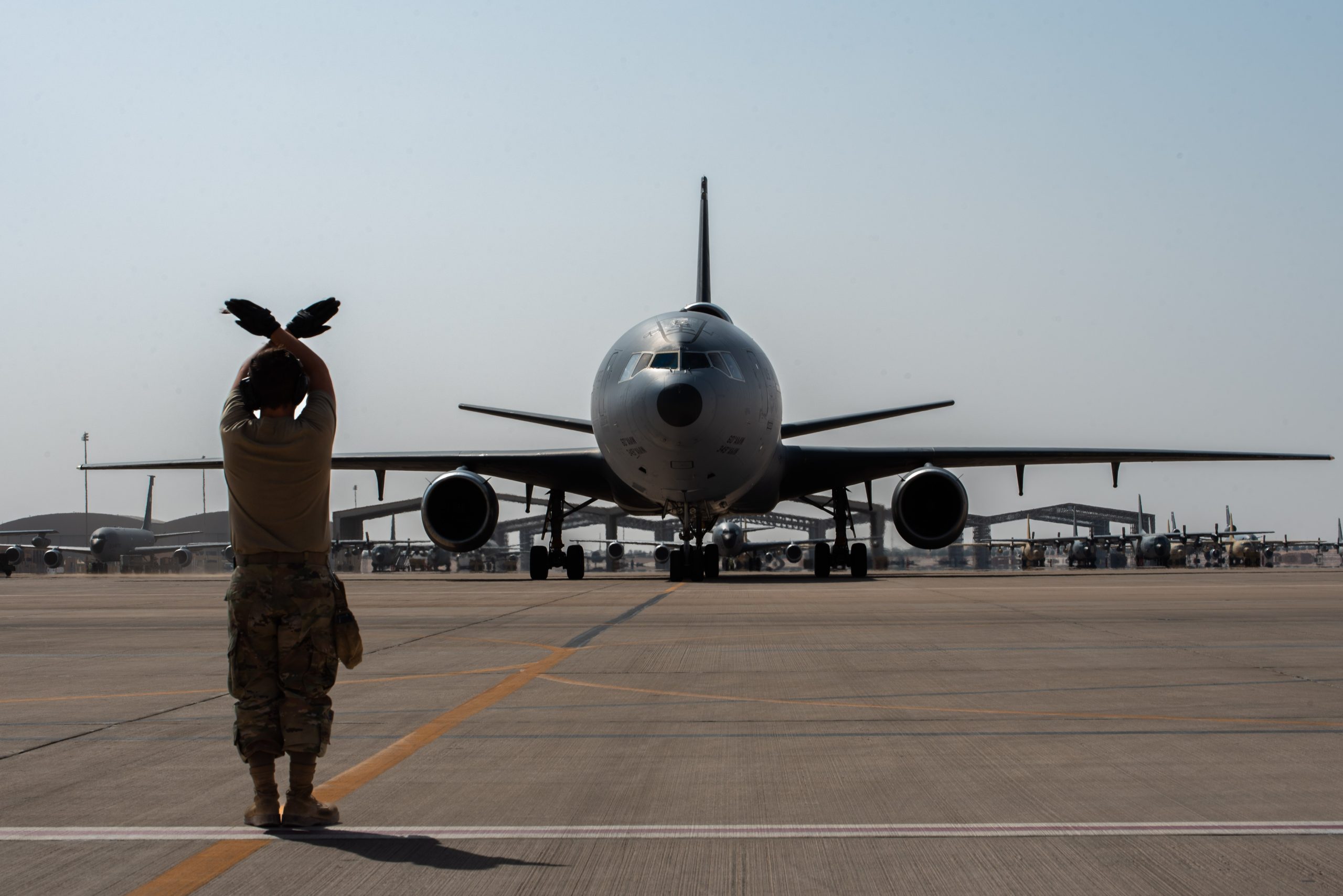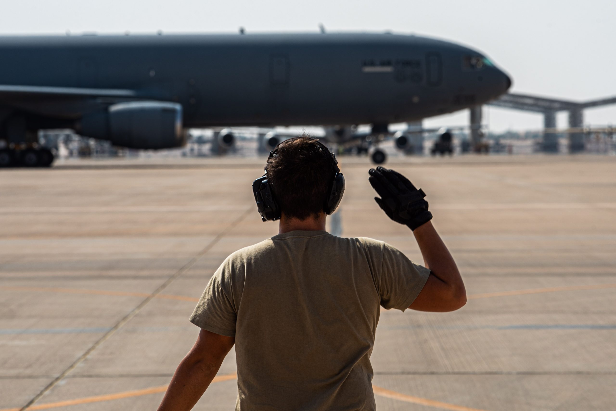 A U.S. Airman waves to a KC-10 as it departs after conducting the airframe’s final combat deployment at Prince Sultan Air Base (PSAB), Kingdom of Saudi Arabia, Oct. 5, 2023. The departure of the KC-10 at PSAB marked the end of the airframe’s over 30 years of service within the U.S. Air Forces Central (AFCENT) Area of Responsibility. By September 2024, the U.S. Air Force’s fleet of KC-10s will be decommissioned and gradually replaced by the KC-46 aircraft. (U.S. Air Force photo by Tech. Sgt. Alexander Frank)