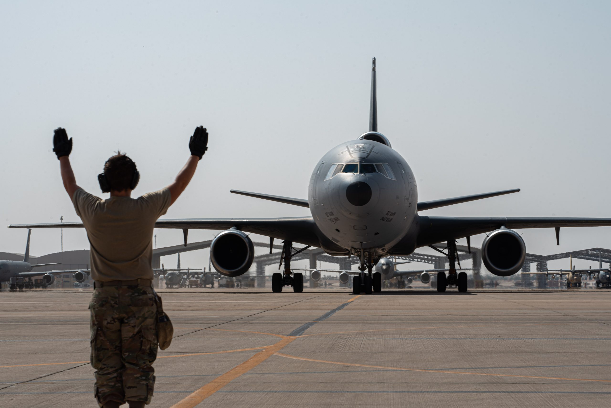 A U.S. Airman from the 378th Expeditionary Aircraft Maintenance Squadron directs a taxiing KC-10 Extender assigned to the 908th Air Refueling Squadron after the aircraft returned from the airframe’s final combat sortie on Prince Sultan Air Base, Oct. 3, 2023. The flight served as a capstone for the KC-10 after over 30 years of service within the U.S. Air Forces Central (AFCENT) Area of Responsibility. By September 2024, the U.S. Air Force’s fleet of KC-10s will be decommissioned and gradually replaced by the KC-46 aircraft. (U.S. Air Force photo by Tech. Sgt. Alexander Frank)