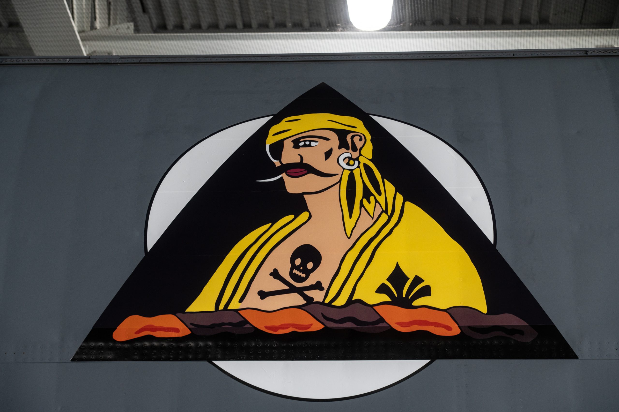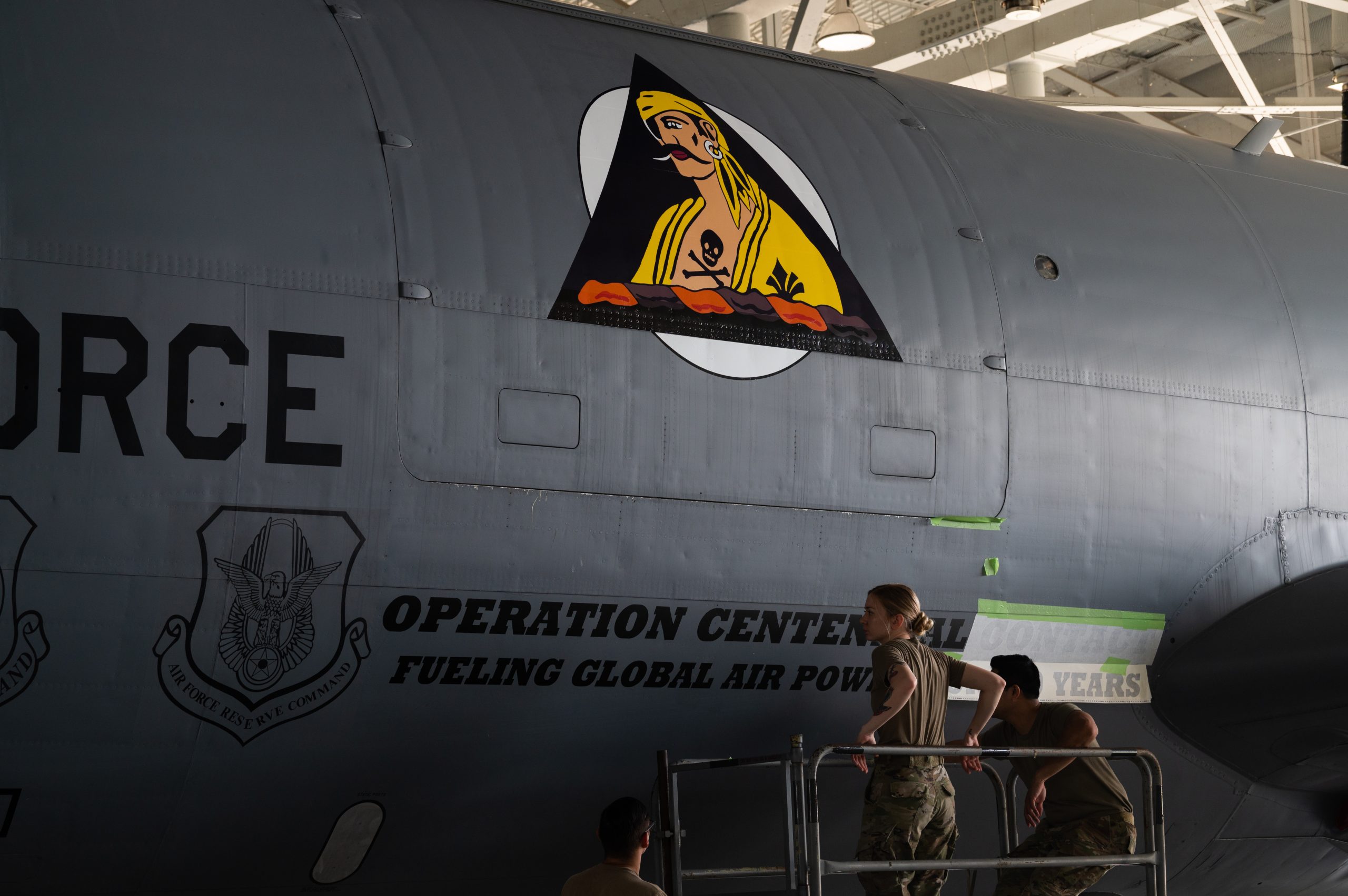 A pirate decal is shown on a KC-135 Stratotanker assigned to the 6th Air Refueling Wing at MacDill Air Force Base, Florida, June 22, 2023. Airmen assigned to the 6th Maintenance Squadron prepared the decal for Operation Centennial Contact, an operation celebrating how air refueling has contributed to global air power for 100 years. U.S. Air Force photo by Airman 1st Class Sterling Sutton