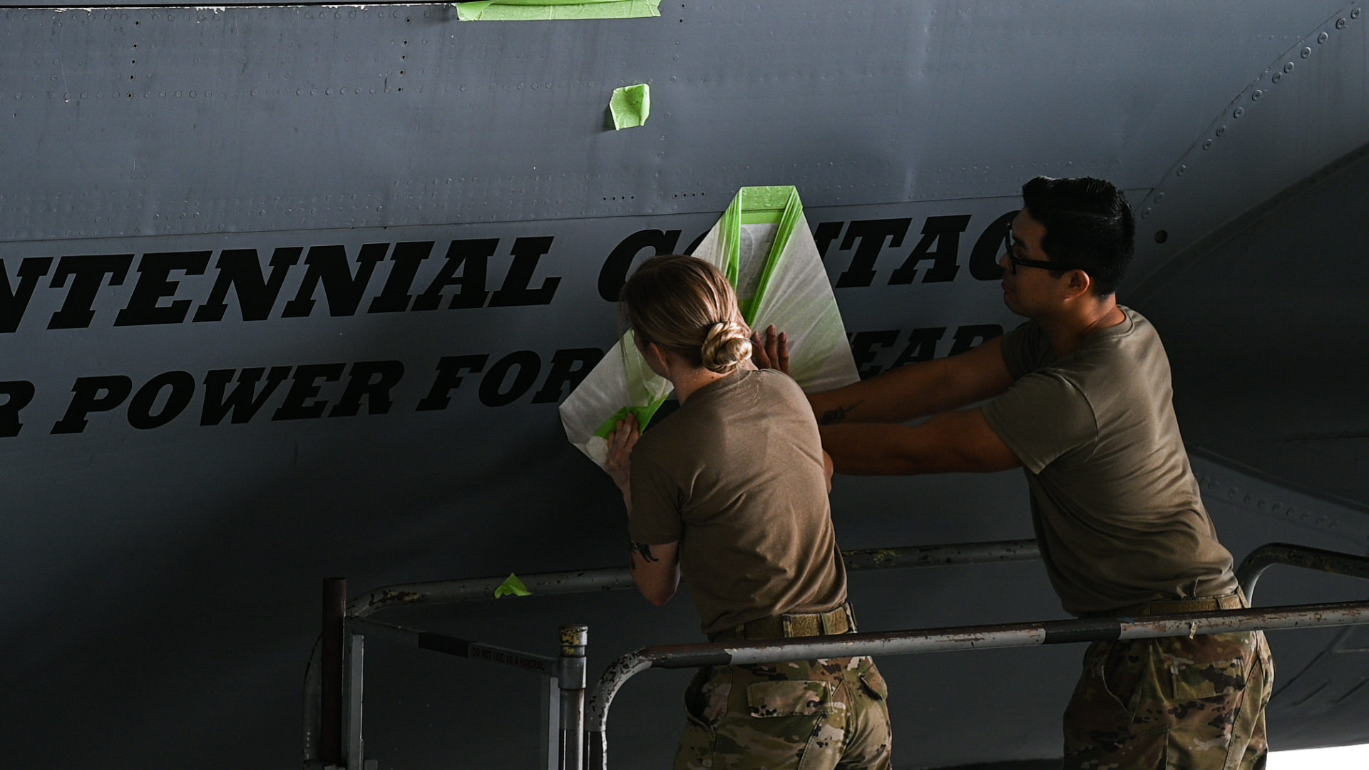 Airmen with the 6th Maintenance Squadron apply a decal on a KC-135 Stratotanker assigned to the 6th Air Refueling Wing at MacDill Air Force Base, Florida, June 22, 2023. The artwork was designed for Operation Centennial Contact, a mission celebrating how air refueling has contributed to global air power for 100 years. U.S. Air Force photo by Airman 1st Class Sterling Sutton