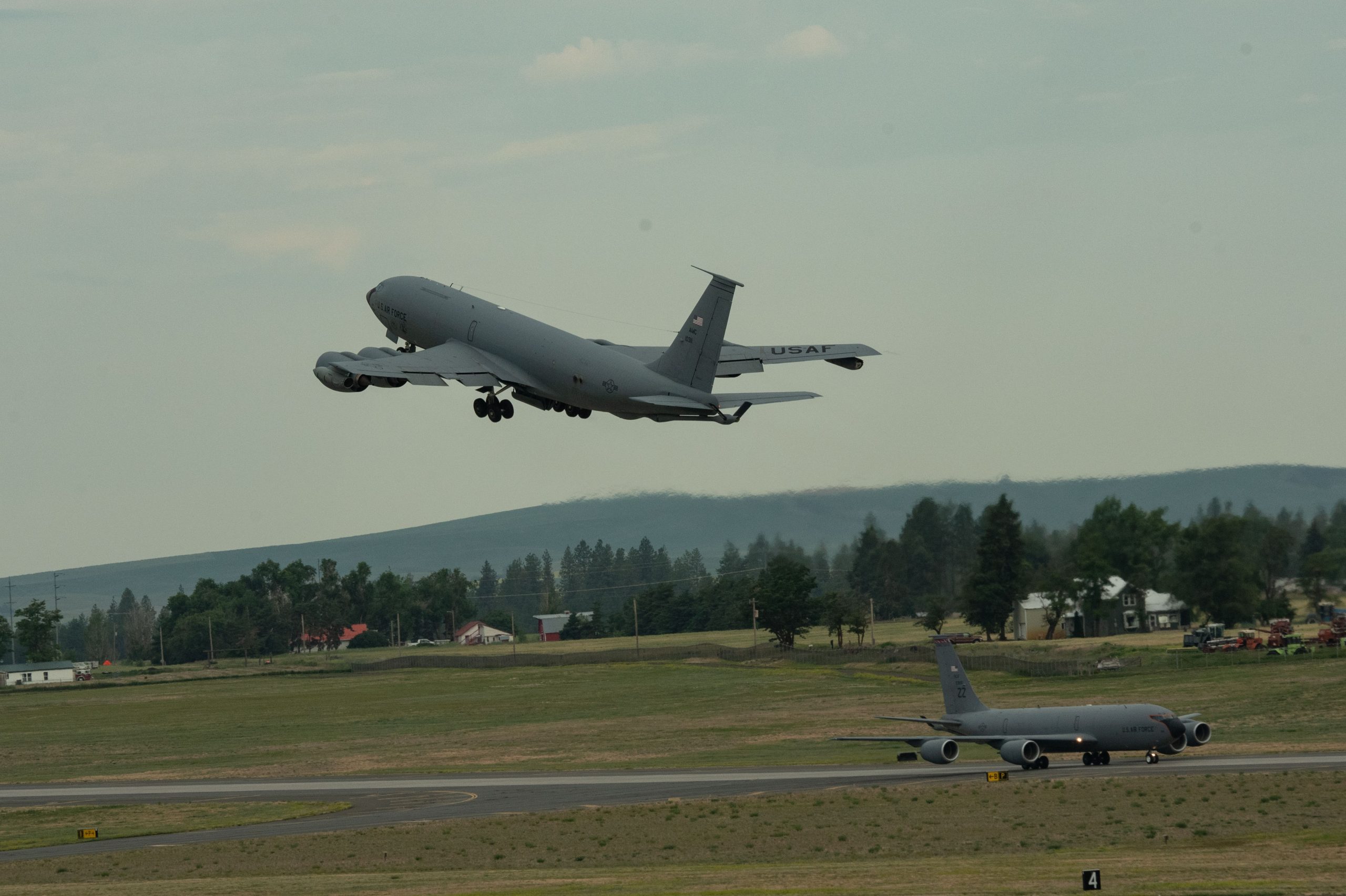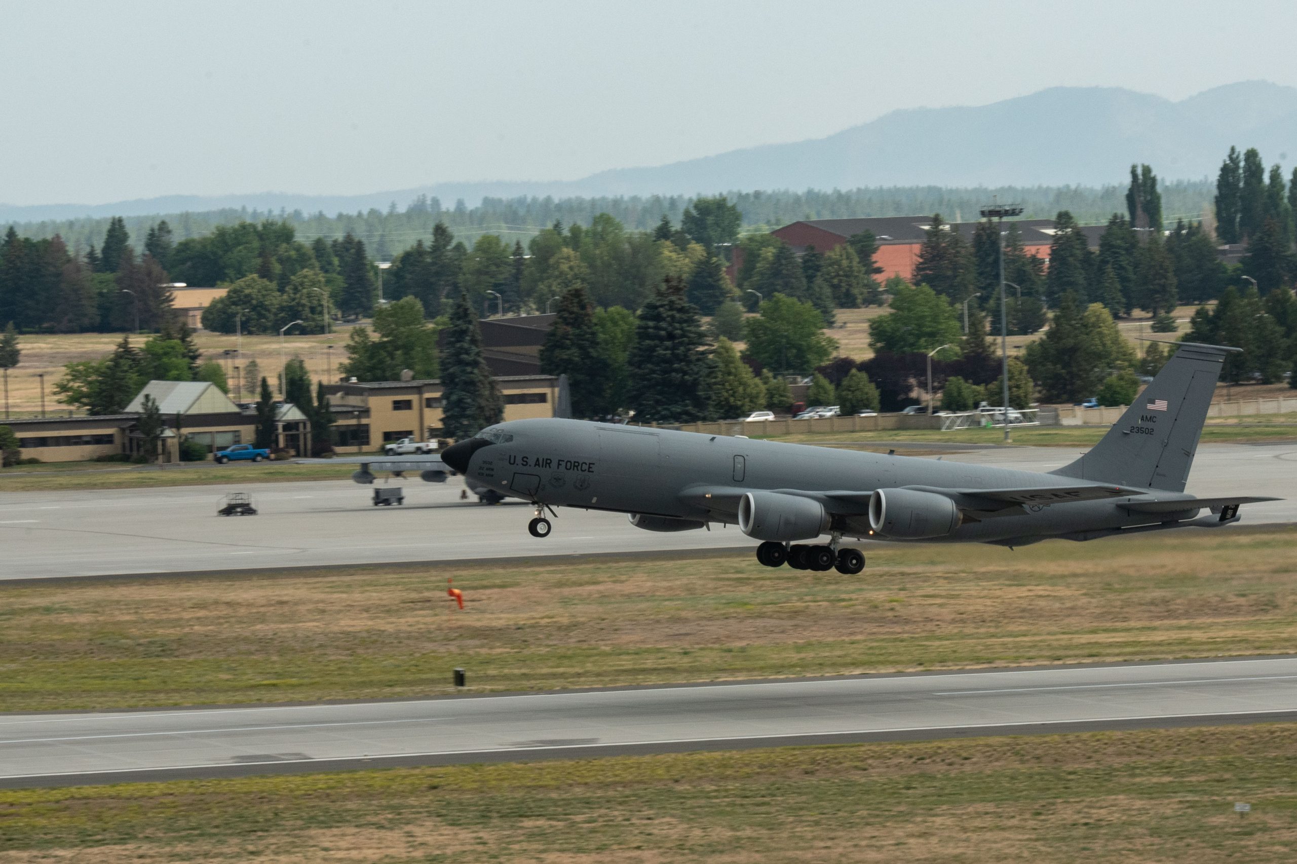 A KC-135 Stratotanker from Fairchild Air Force Base takes off from the flightline as part of Operation Centennial Contact at Fairchild Air Force Base, Washington, June 27, 2023. The movement, which included stops at Yellowstone National Park, Mount Rushmore and Glacier National Park, was part of Air Mobility Command’s celebration of 100 years air refueling operations and demonstrated the 92nd Air Refueling Wing’s global reach capabilities. Since its inception in 1923, Air refueling has become a crucial component of military and civilian aviation operations around the world by extending the range and endurance of aircraft and enabling them to complete missions that would otherwise be impossible or require multiple stops. As a result, this capability is essential for strategic and tactical operations, as well as humanitarian relief efforts in support of AMC, U.S. Transportation Command and Department of Defense priorities. U.S. Air Force photo by Airman 1st Class Clare Werner