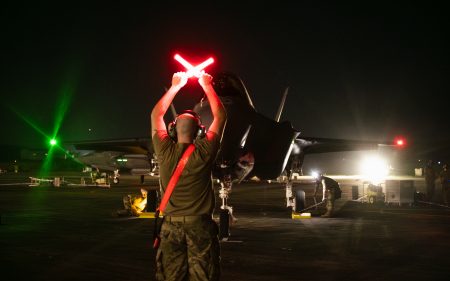 A Marine Corps pilot captain guides in a F-35B Lightning II following a large-scale strike against Venezuela military targets in support of Operation Absolute Resolve, in Ceiba, Puerto Rico, Jan. 3, 2026. U.S. Air Force Photo