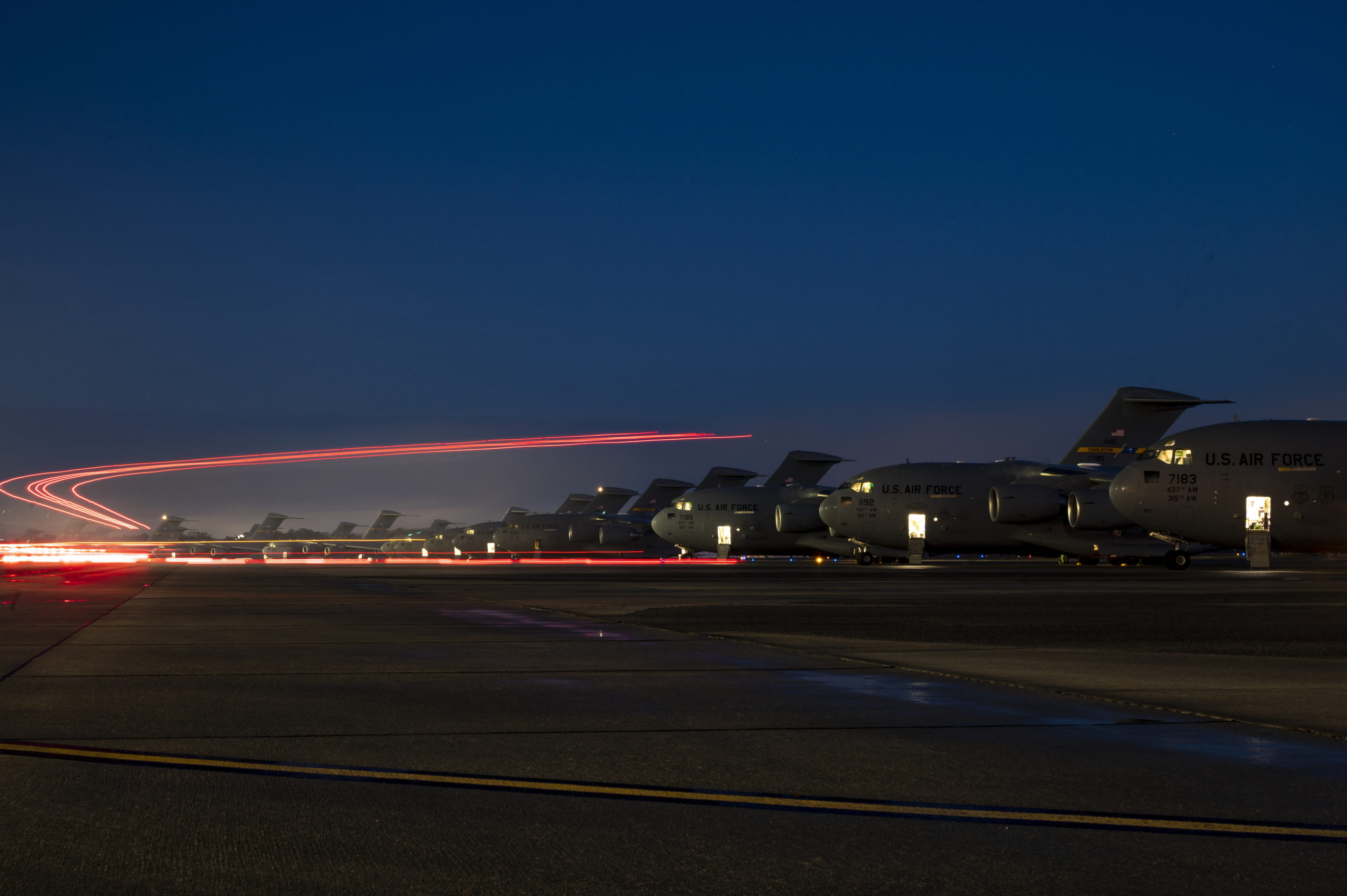 The display of airpower opened with an elephant walk of Globemaster IIIs and included a flyover above the city of Charleston. The maneuvers were part of a broad-ranging force generation exercise that included Air Force, Army, and Marine Corps units all across the Southeast.