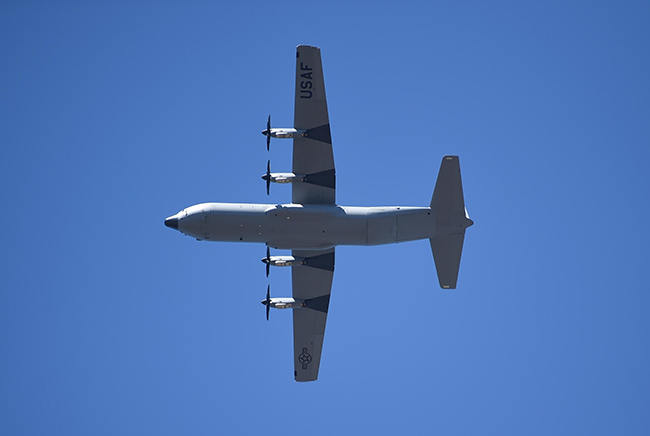 A C-130J from Keesler AFB, Miss., flies over Little Rock AFB, Ark., during a fly-in exercise on March 15, 2019. Air Force photo by SSgt. Dana J. Cable.