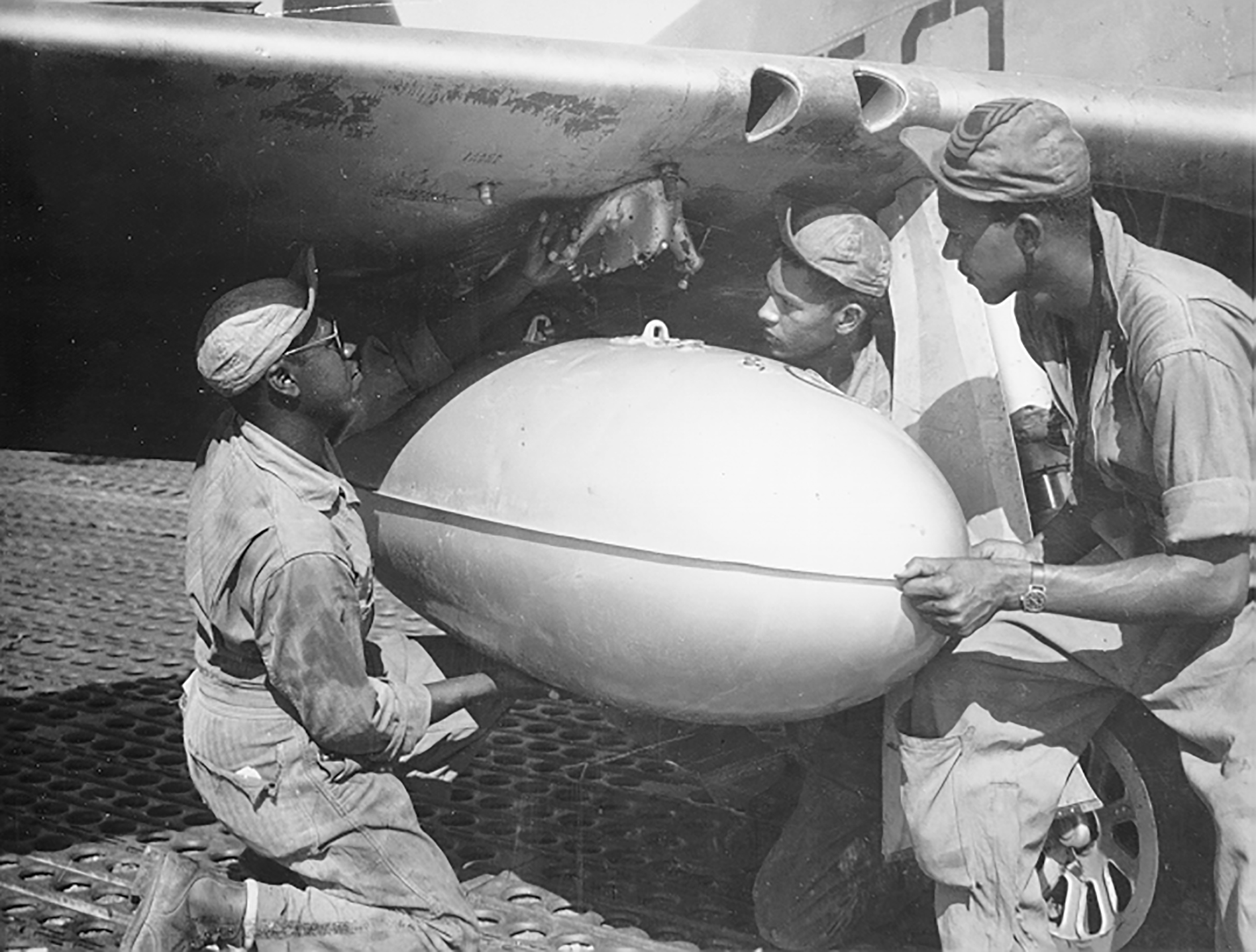 “Red Tail” P-51s of the 332nd Fighter Group take off on a bomber-escort mission in August 1944. Black units flew P-39s, P-40s, P-47s, P-51s, and B-25 Mitchell bombers, but the bomber crews did not see combat. The Tuskegee units saw their first combat in North Africa, then moved to bases in Sicily and then to the mainland of Italy.
