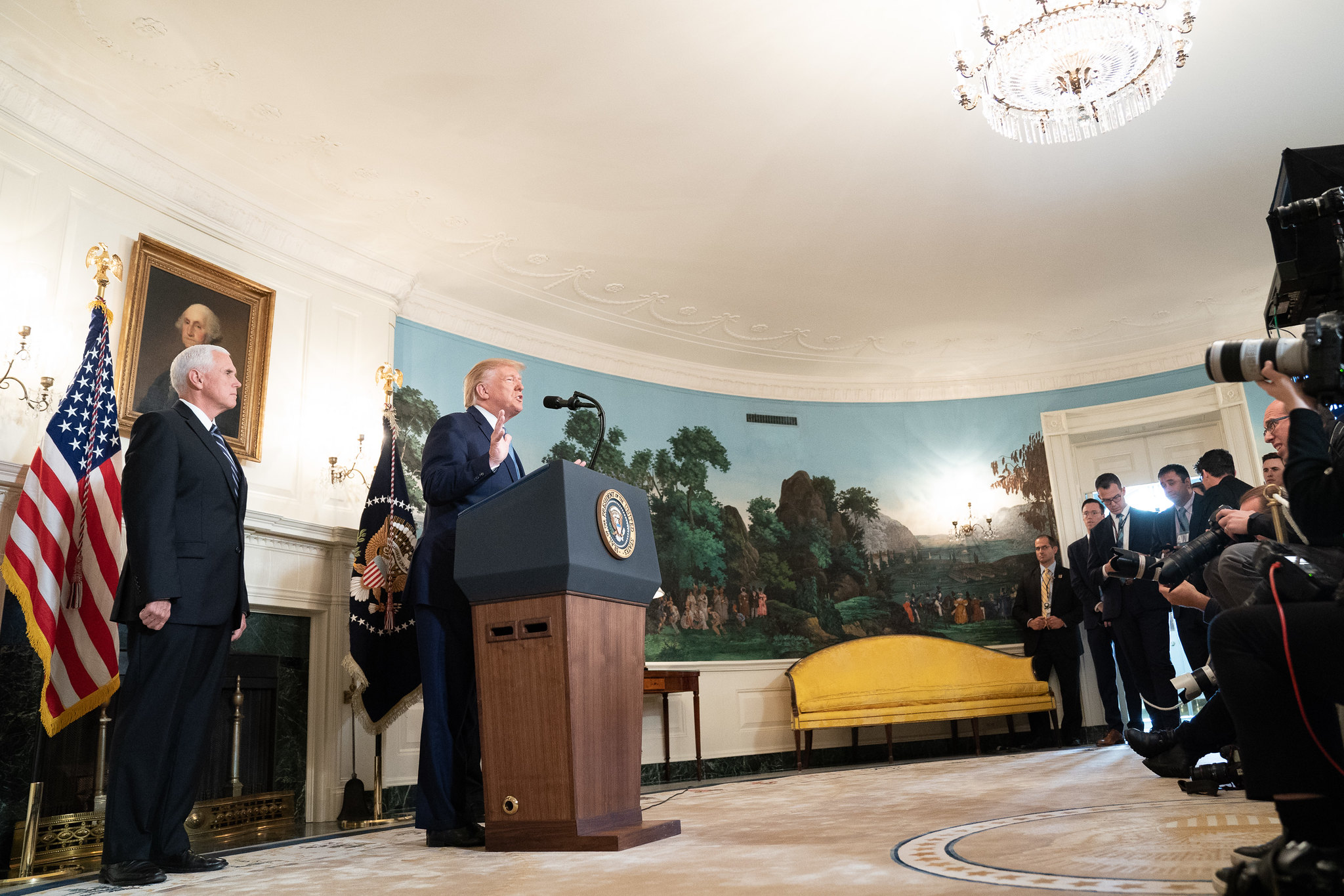 President Donald Trump, joined by Vice President Mike Pence, speaks Oct. 23, 2019, at the White House. White House Photo by Shealah Craighead