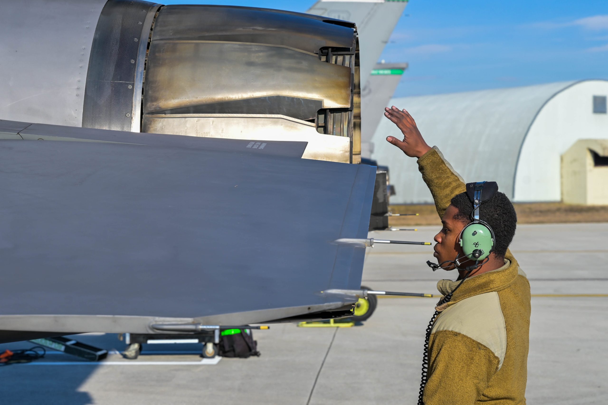 U.S. Air Force Senior Airman Xavear Cullors, 555th Fighter Generation Squadron dedicated crew chief, inspects a U.S. Air Force F-16 Fighting Falcon before it takes off for bilateral air-to-ground training with joint terminal attack controllers from U.S. Army Special Operations Forces and the Armed Forces of Bosnia and Herzegovina at Aviano Air Base, Italy, Jan. 8, 2024. This bilateral training is an example of advanced military-to-military cooperation that contributes to peace and security in the Western Balkans and throughout Europe. (U.S. Air Force photo by Airman 1st Class Zachary Jakel)
