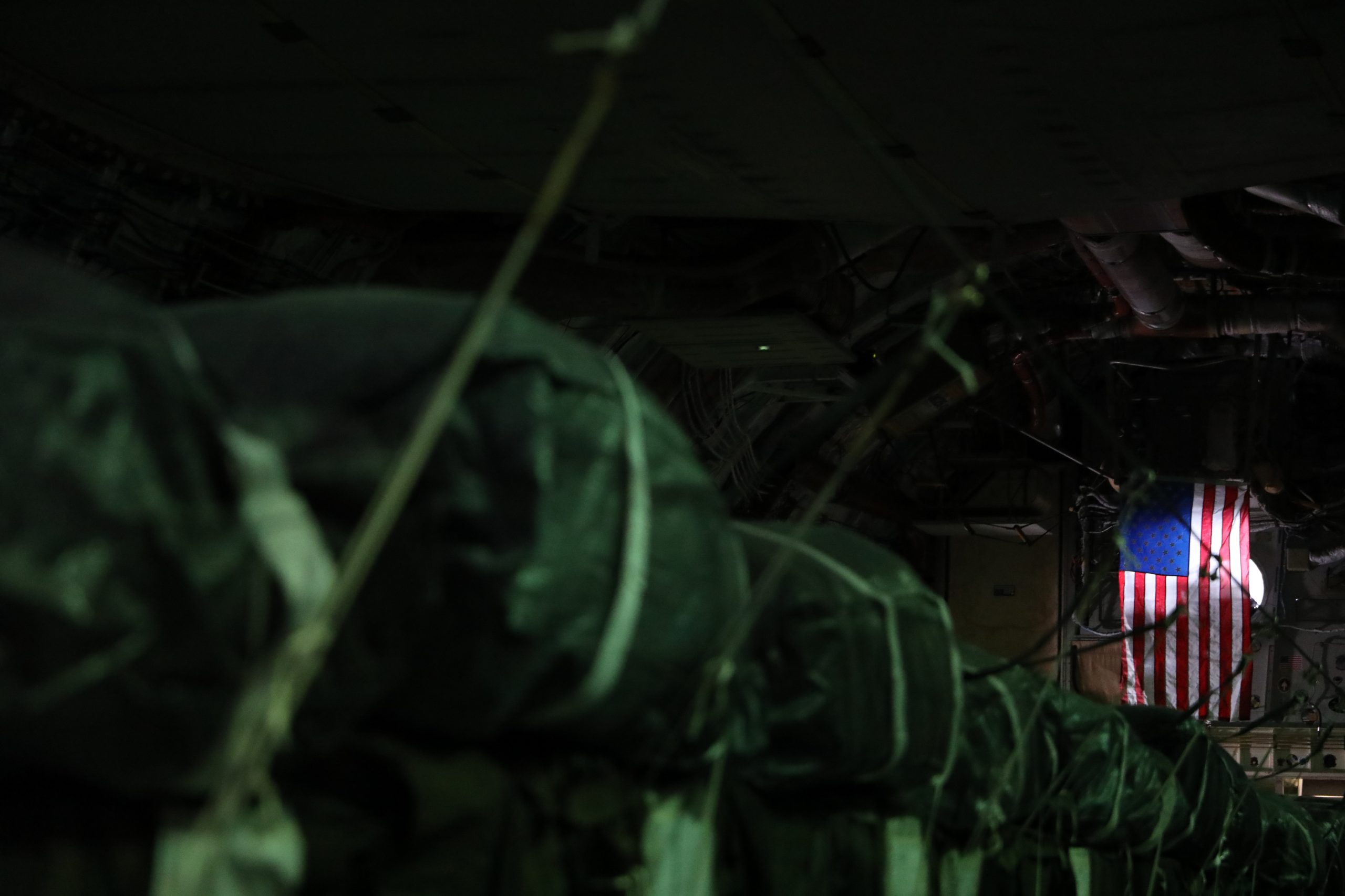 Half an hour out, Boone and other Airmen run their last checks. The aircraft creaks as it depressurizes, and the dim green lighting is replaced by bright flood lights. A loadmaster starts removing straps tying down the bundles to the floor.