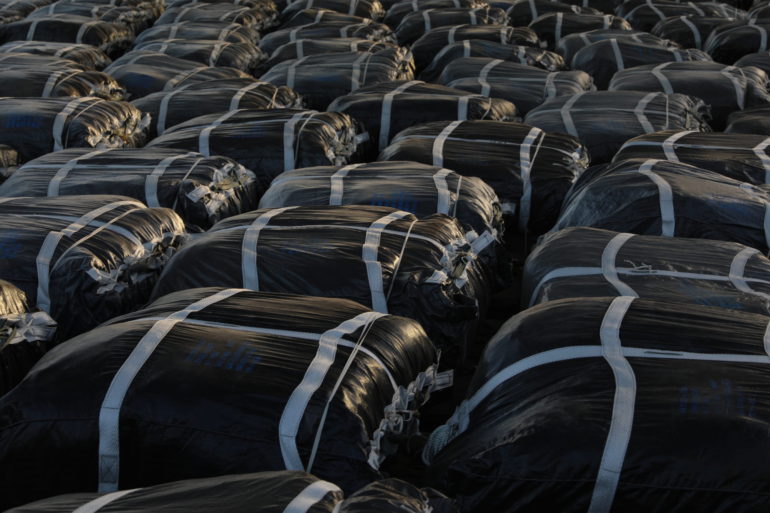 Each bundle is assembled on a simple wooden pallet, or skid board, which in turn is topped with two layers of energy-absorbing honeycombed material and then MREs in cardboard boxes. The whole bundle is wrapped in plastic, then wrapped into an A-22 Cargo Bag—a canvas package covered in netting—which Soldiers secure tightly with nylon ties. Parachutes are added to slow the descent of the 1,250-pound pallets to the ground.